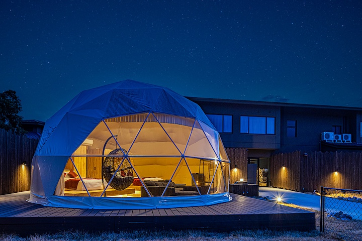 ドームテント、ヴィラ、コテージなど、さまざまな宿泊スタイルが選べます。